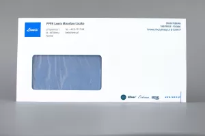 - Kopertę DL samoklejącą listową z paskiem samoprzylepnym, okienkiem lewym o gramaturze 80 g/m2 oraz dowolny kolorowy nadruk według konfiguracji.