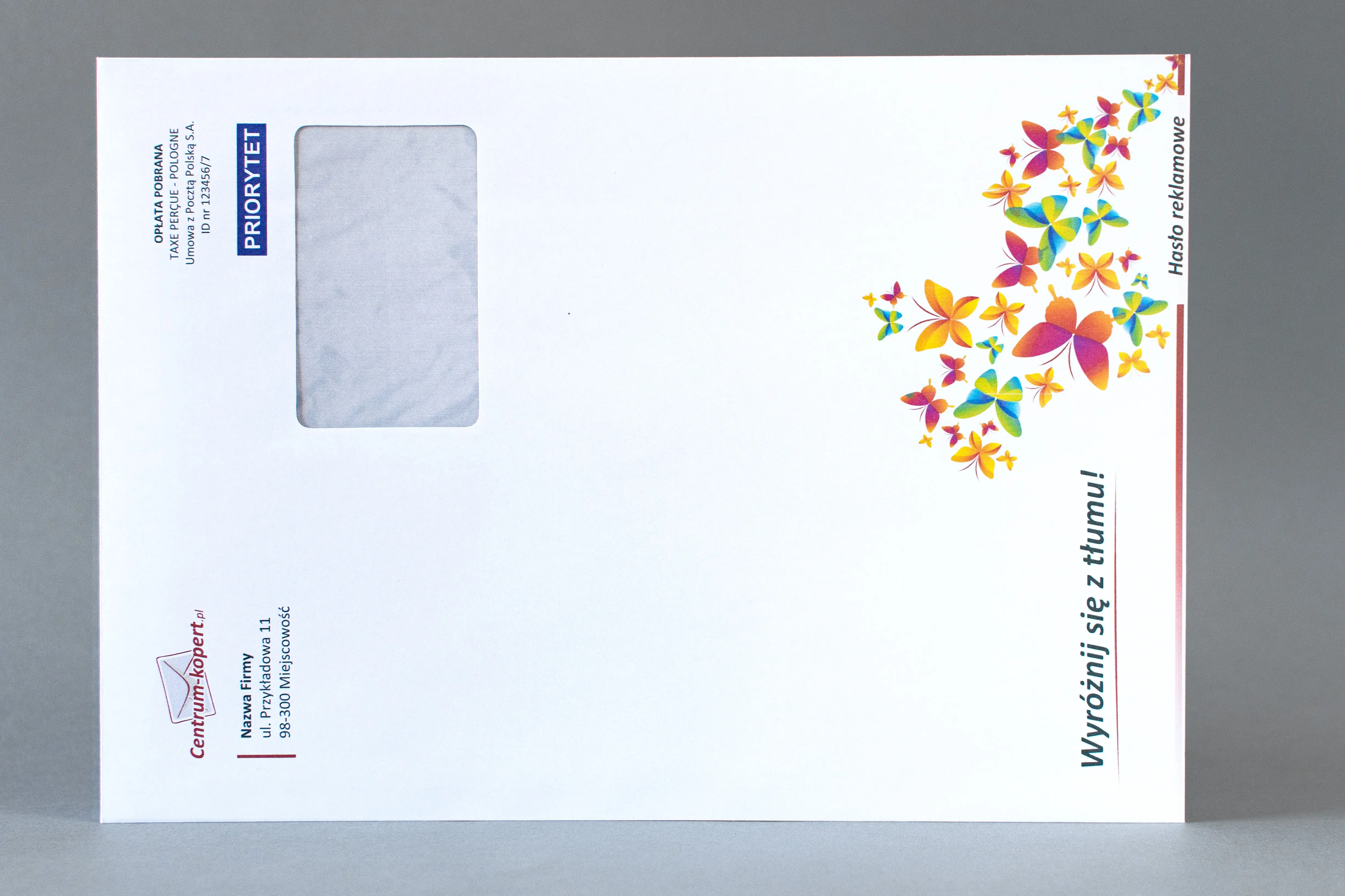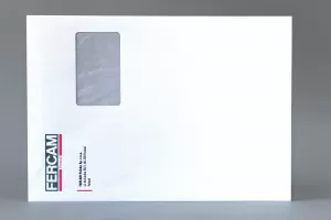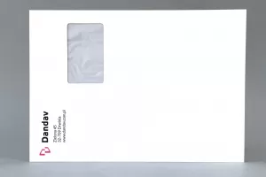 Koperty samoklejące C4 z paskiem o wymiarze 229×324 mm z dowolnym nadrukiem (4+4). Oferujemy pełnokolorowy nadruk na białej kopercie C4. Koperty posiadają prawe okienko (45×90 mm).