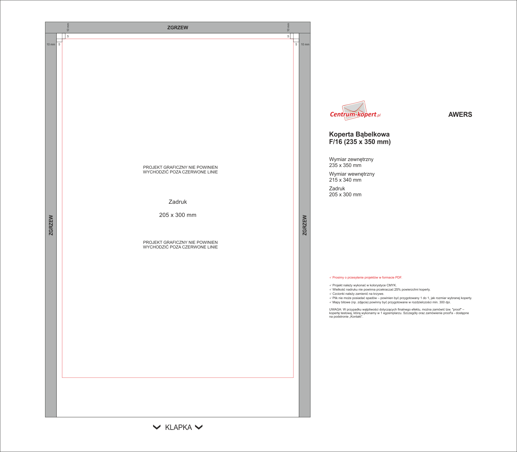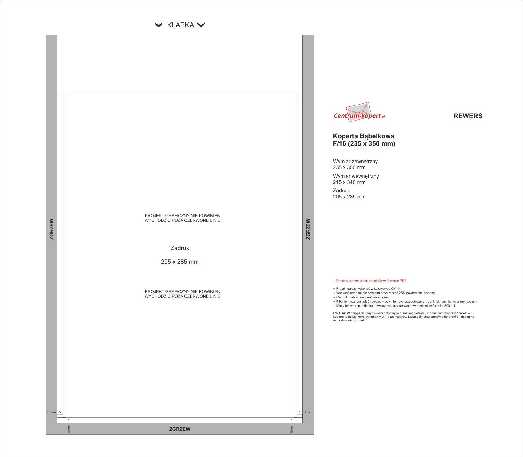 Jeśli chcą Państwo sami przygotować projekt - wystarczy skomponować plik według specyfikacji dostępnej na podstronie: Jak przygotować projekt graficzny koperty?