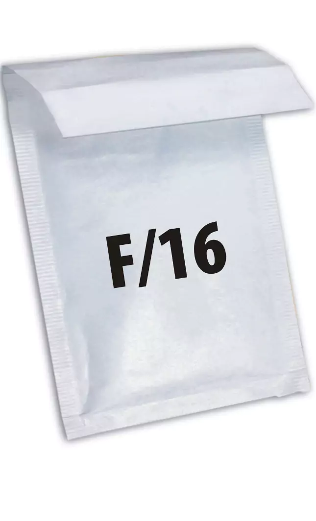 Koperta bąbelkowa F/16 (aktowa - zamykająca po krótkim boku) posiada klapkę prostokątną z paskiem samoprzylepnym. Pasek ochronny przykrywa klej, dzięki czemu ten nie wysycha.
