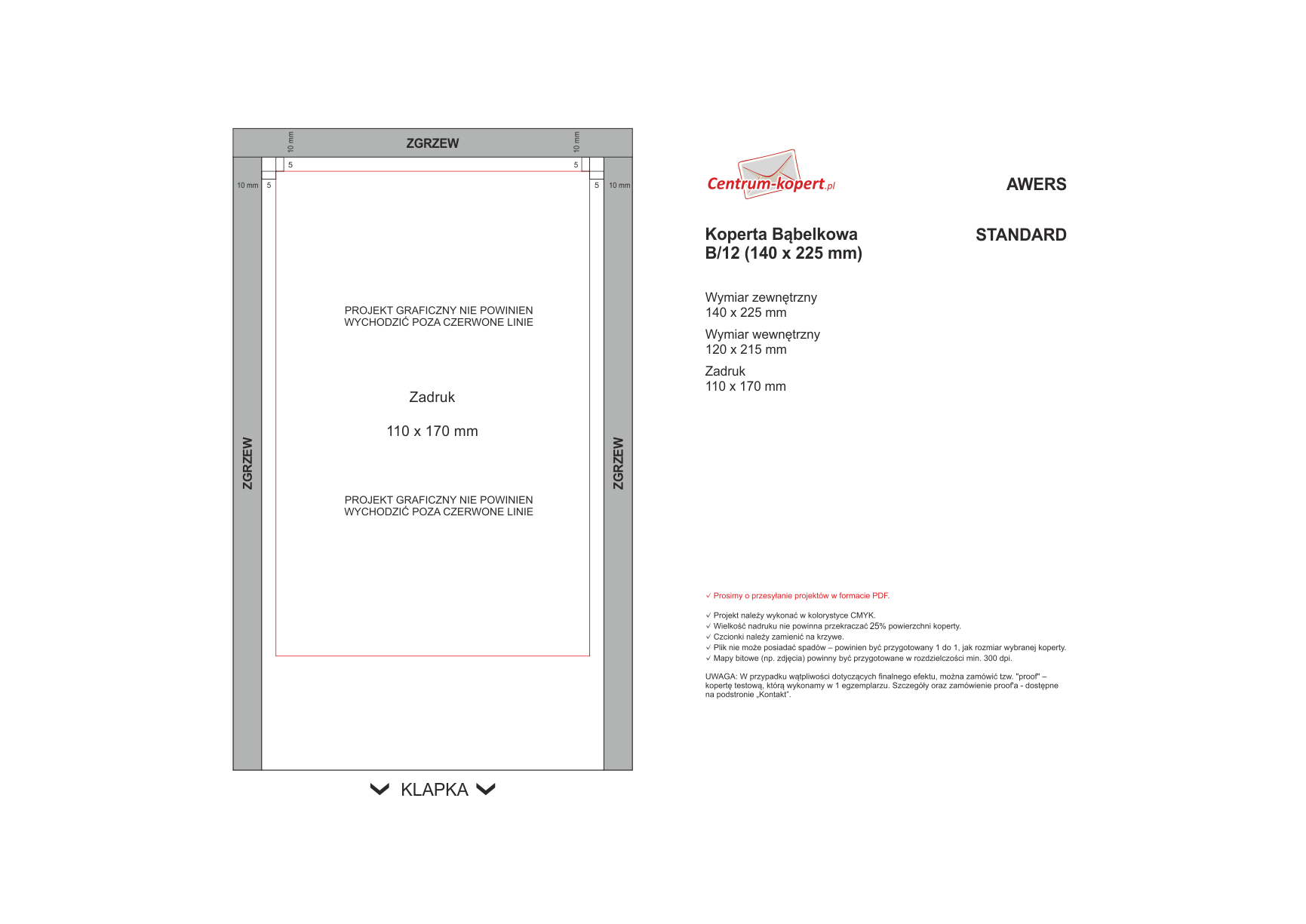 Jeśli chcą Państwo sami przygotować projekt - wystarczy skomponować plik według specyfikacji dostępnej na podstronie: Jak przygotować projekt graficzny koperty?
