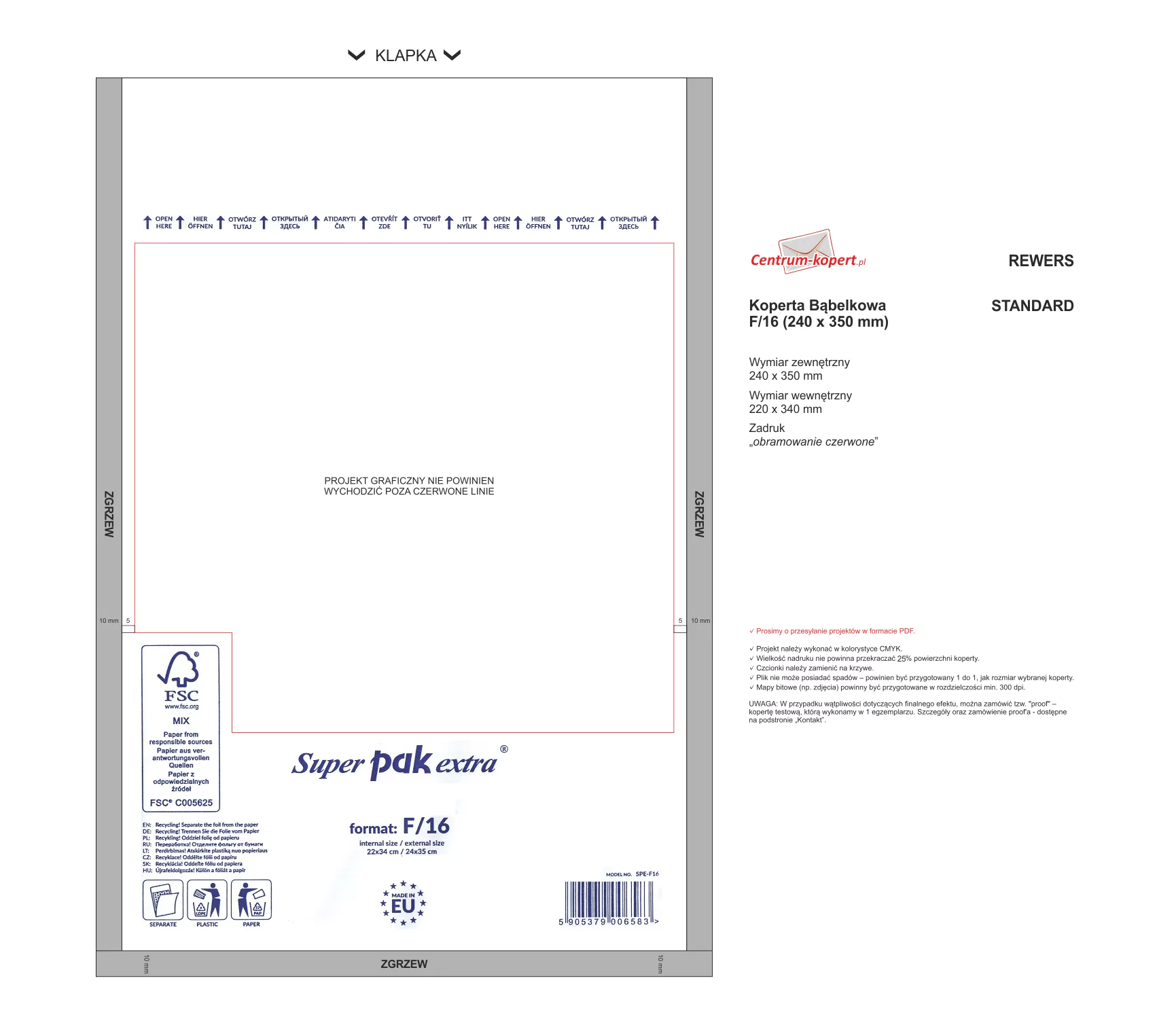 Koperta bąbelkowa F16 (aktowa - zamykająca po krótkim boku) posiada klapkę prostokątną z paskiem samoprzylepnym. Pasek ochronny przykrywa klej, dzięki czemu ten nie wysycha.